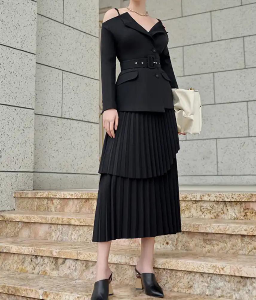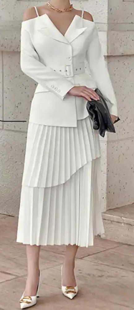An elegant and elegant two-piece suit with a blazer top with a contemporary cut and a pleated skirt, available in black and white.